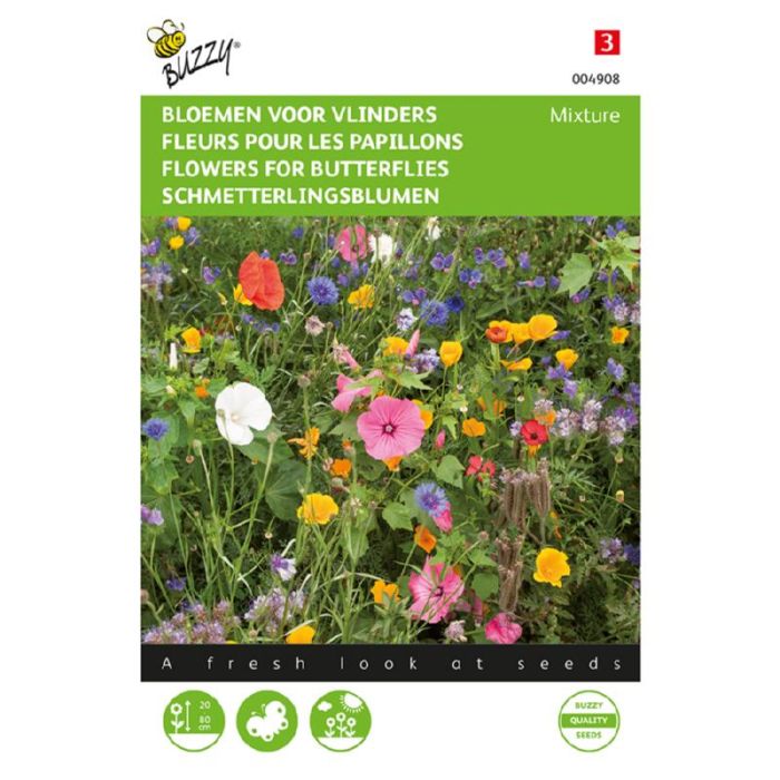 Het Buzzy® Bloemen voor vlinders mengsel brengt een levendige bloeipracht van meer dan twintig eenjarige soorten, speciaal samengesteld om door en door vlinders en bijen aan te trekken, en zo elke tuin om te toveren tot een bruisend ecosysteem.