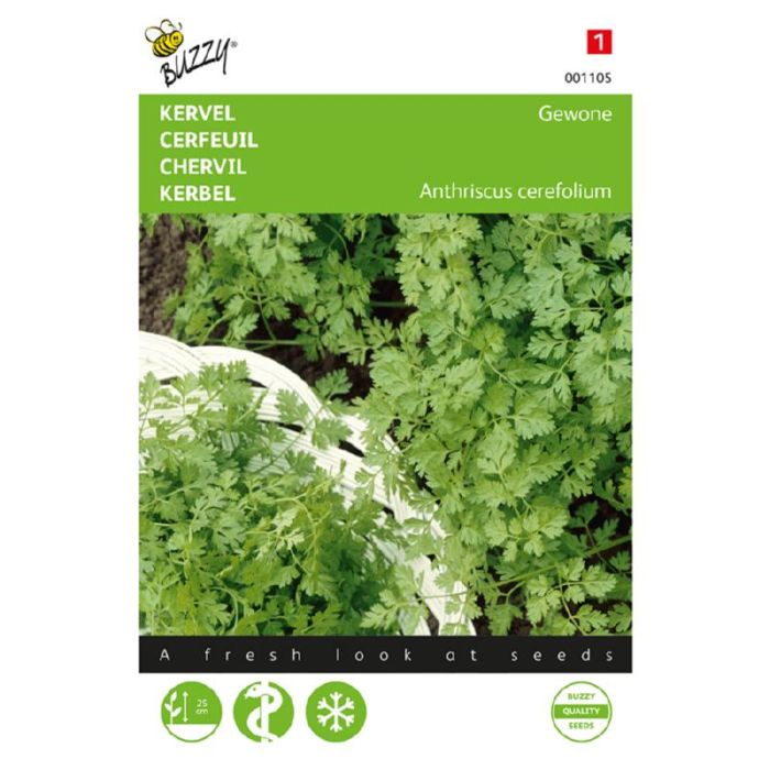 Buzzy® Kervel Gewone is een fijnbladig, 25 cm hoog kruid dat van maart tot september in de volle grond kan worden geteeld. Het levert meerdere oogsten per jaar, behoudt smaak na invriezen en is ideaal voor zowel de hobbytuinder als de professionele kweker.
