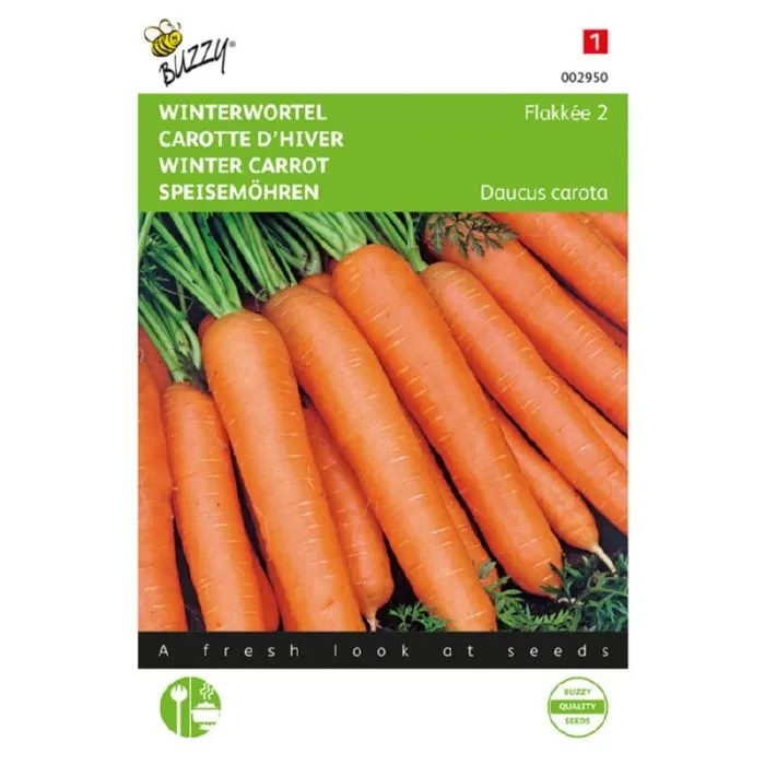 De Buzzy® Wortelen Flakkée 2 is een productief winterwortelras met zoete, oranjerode wortels die ideaal zijn voor opslag gedurende de koude maanden. Ze gedijen op zonnige, volle grond en geven een rijke oogst van oktober tot november.